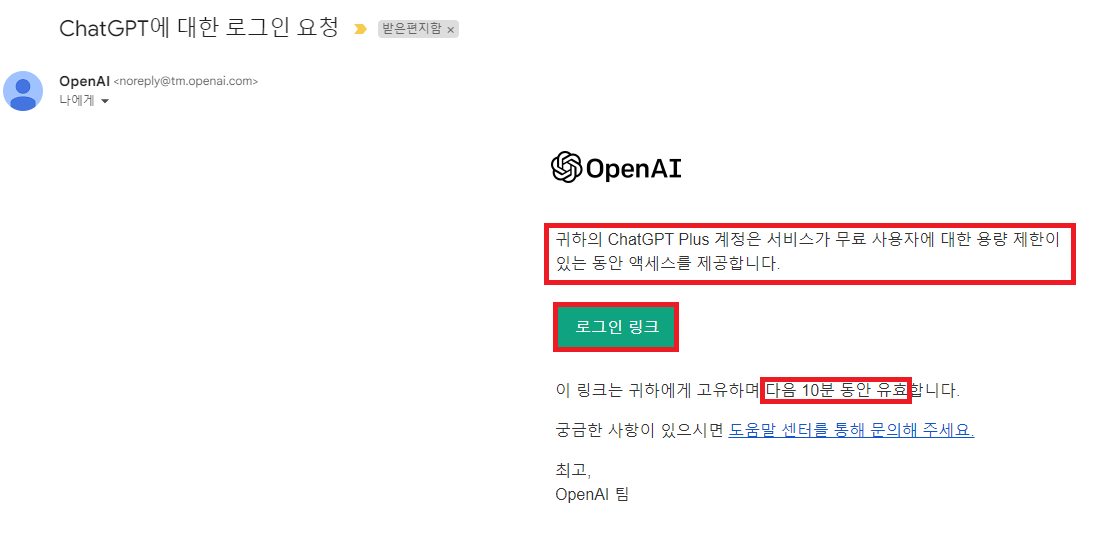 우클릭으로 한국어 번역을 한 내용이고, 실제로는 Open AI팀에서 영어로 메일이 온다. '무료 사용자에 대한 용량 제한이 있는 동안 액세스를 제공합니다.' 라는 문구를 보아하니, 무료 사용자들과는 다른 접속 경로를 제공해주는 것 같았다. 해당 로그인 링크는 10분 간만 유효하다고 하니 빠르게 확인하는 것이 좋겠다.