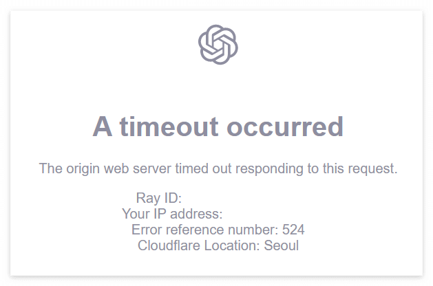 주로 Error Code: 524를 보여주는데, 이 에러 코드는 Chat GPT에서 서버와 클라이언트 간의 연결이 타임아웃 되었음을 의미한다. 그에 대한 해결 방법으로는 무수히 많은 블로그와 Chat GPT에서 조차 방화벽 설정이나 재부팅, 네트워크 문제를 해결하라고 말하지만 애꿎은 네트워크 탓을 할 필요는 없다. 우리가 이 오류 코드를 만나게 되면 거의 대부분 그냥 트래픽이 몰려서 서버가 부하를 감당하지 못하고 있다고 생각하면 된다.