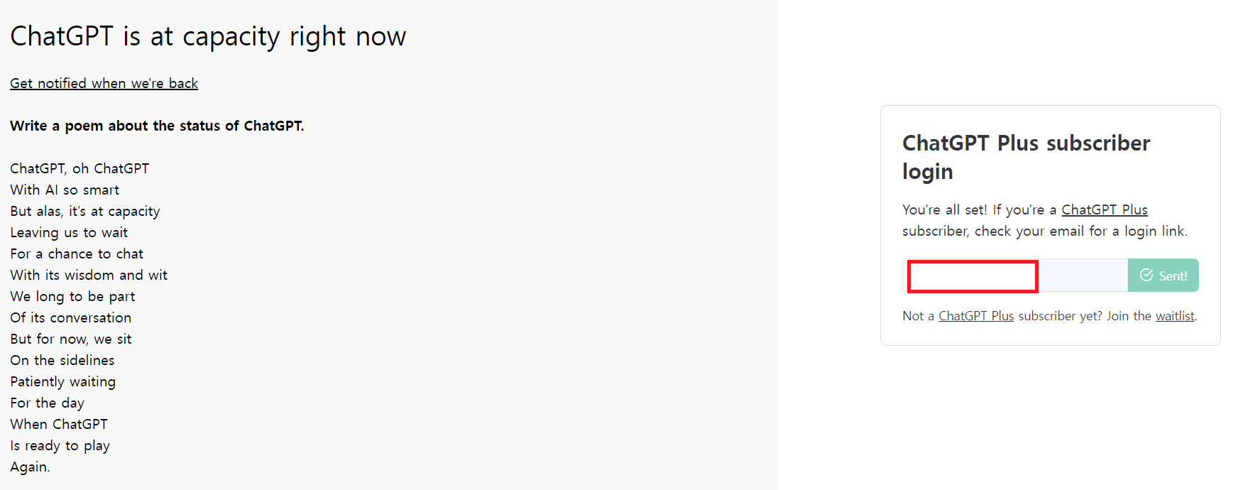 좌측의 내용은 대충 서버 용량, 부하가 가득 찼다고 상단의 밑줄 버튼을 누르면 다시 사용할 수 있을 때 알려 주겠다는 뜻이다. 그러나 Plus 요금제 사용자, 그러니까 유료 사용자들은 우측에 주목해야 하는데 저기에 Chat GPT 가입 당시에 사용했던 이메일을 작성하고 Sent 버튼을 누르면 해당 계정으로 메일을 하나 보내준다.